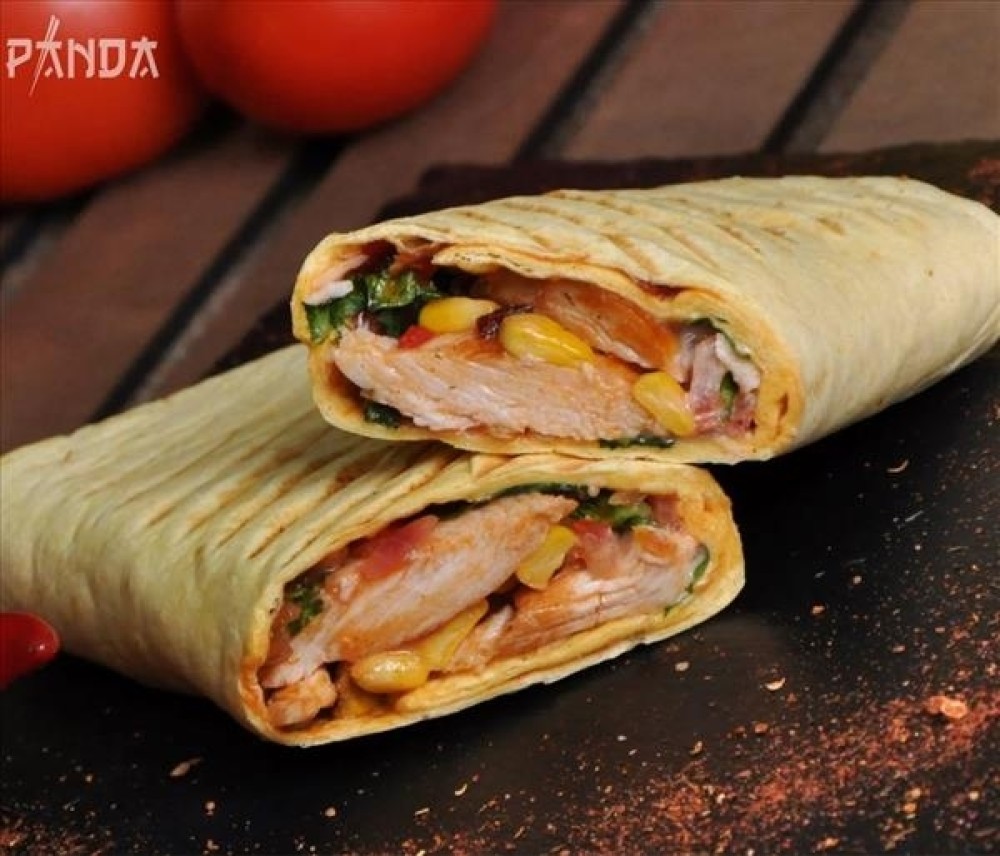 Мексиканская сырная лепешка тортилья, курица копченая, кукуруза, помидор, пекинская капуста, острый соус, фирменный соус