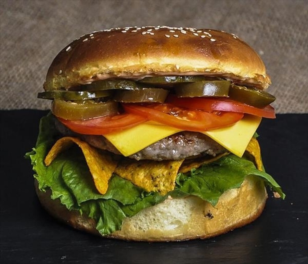 Сочная котлета из говядины, маринованные огурчики, свежий томат, пекинская капуста, ломтик сыра Чеддер, фирменный острый соус перчик халапеньо, кукурузные чипсы, фирменная булочка