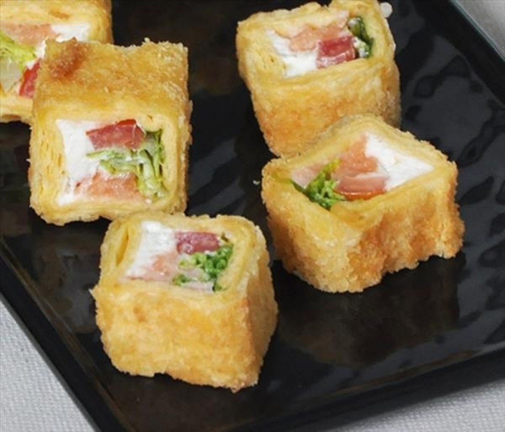 Сырная лепешка тортилья, творожный сыр, сёмга, помидор, лист салата, кляр, панировочные сухари
