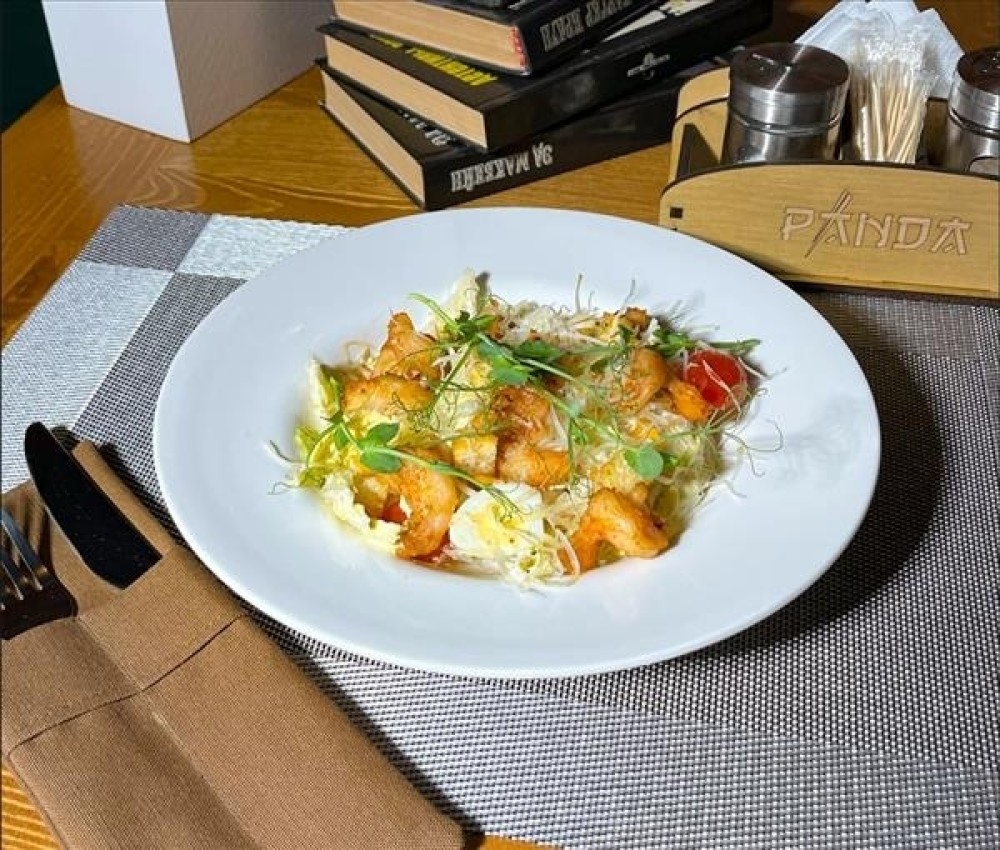 Лист салата, фирменный соус цезарь, томаты черри, перепелиные яйца, сухари, жареные тигровые креветки, сыр пармезан