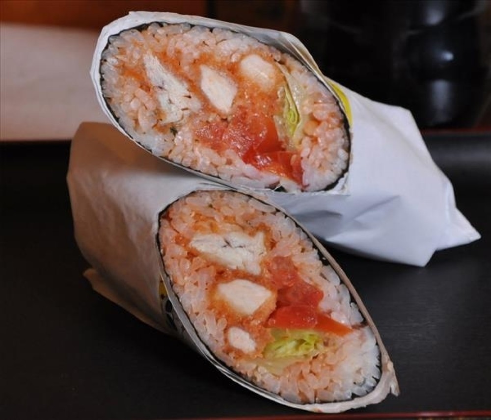 Жареная куриная грудка в панировке, помидор, лист салата, острый соус
