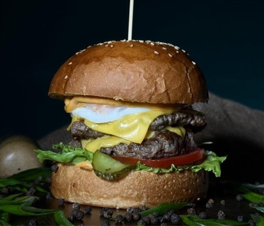 Фирменный бургер от панды с двумя сочными котлетами из говядины, маринованные огурчики, свежий томат, пекинская капуста, два ломтика сыра Чеддер, фирменный соус, жареное яйцо, фирменная булочка