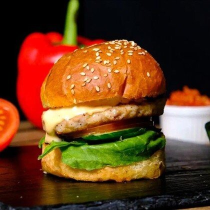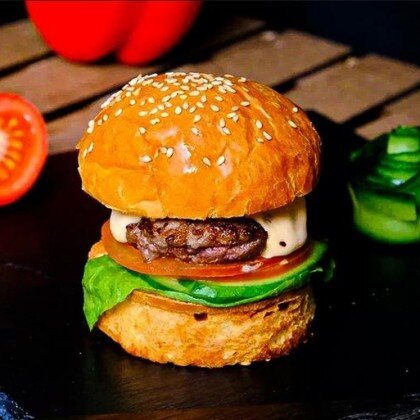 Сочная котлета из говядины, маринованные огурчики, свежий томат,пекинская капуста, фирменный соус, фирменная булочка