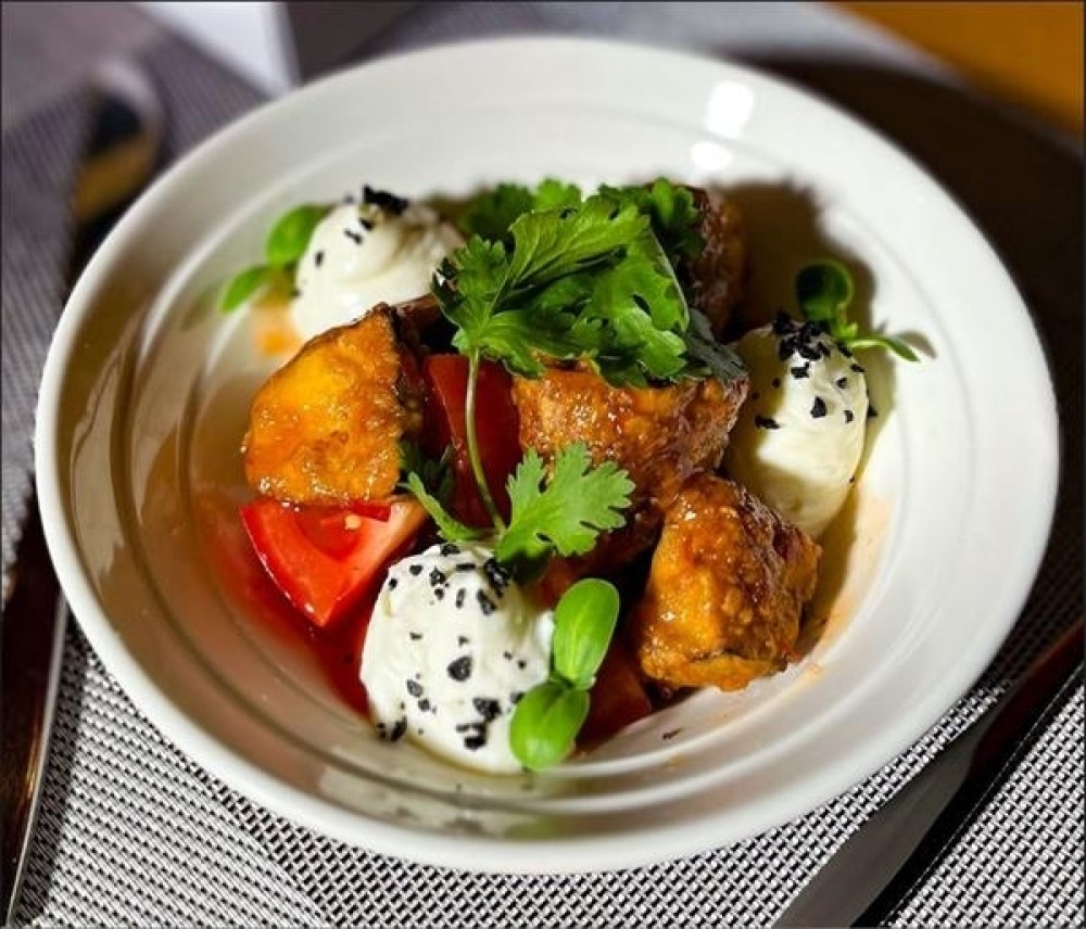Хрустящие остро-сладкие баклажаны, свежие томаты, нежный творожный крем, кинза