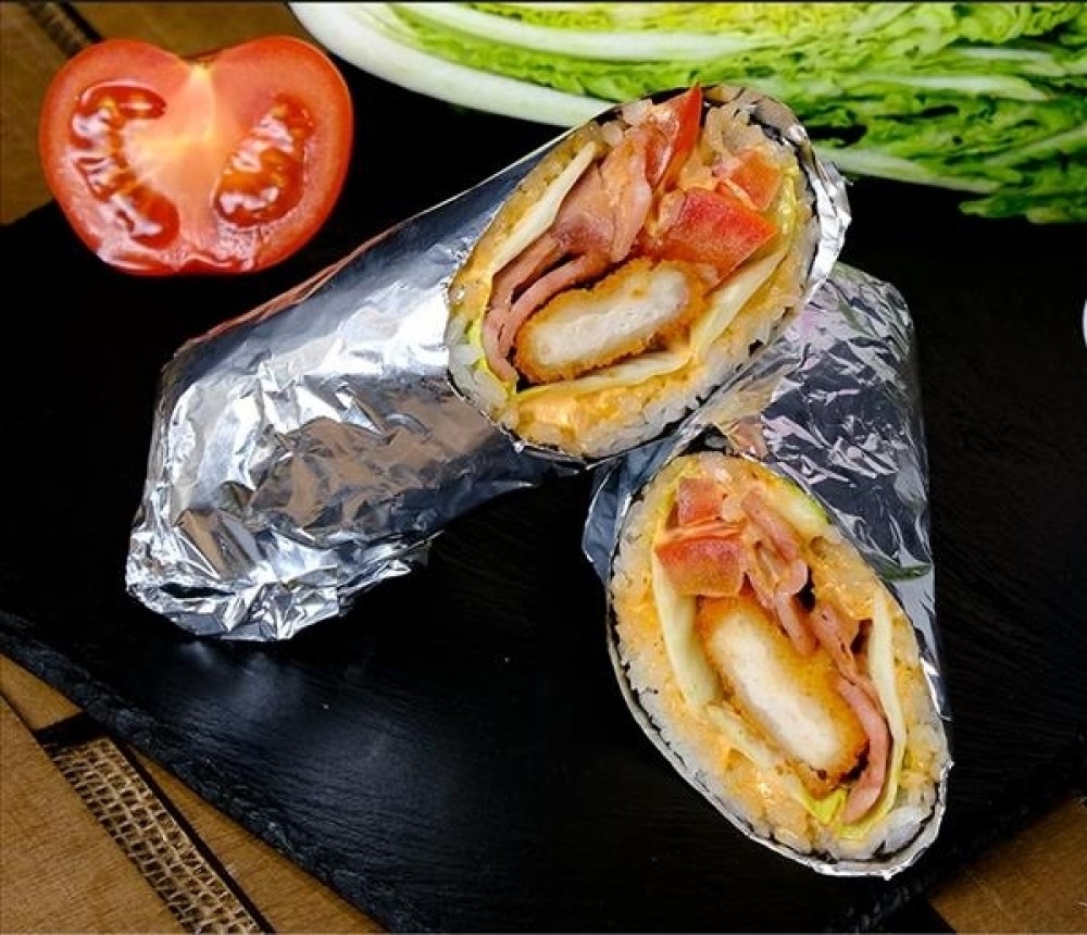 Жареная куриная ветчина, лист салата, помидор, наггетсы, спайси соус, рис, лист нори