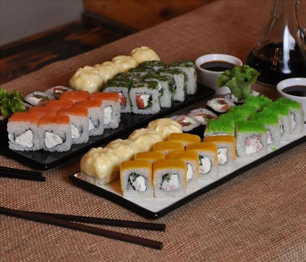 Сет из 48 роллов со скидкой 24% из четырех холодных и двух запеченых роллов:-Фила оптима - творожный сыр, нори, лосось, рис;-Зеленый - творожный сыр, нори, перец болгарский, лист салата, зелень, рис;-Кунсей - творожный сыр, кунжут, нори, икра тобико, крабовые палочки, ветчина куриная, рис;-Киото - творожный сыр, нори, перец болгарский,лист салата, лосось, огурец, рис;-Чиз гриль - сыры творожный и чеддер, нори, крабовые палочки, огурец, спайси соус;-Сегун - сыры моцарелла и творожный, нори, лосось, огурец, рис