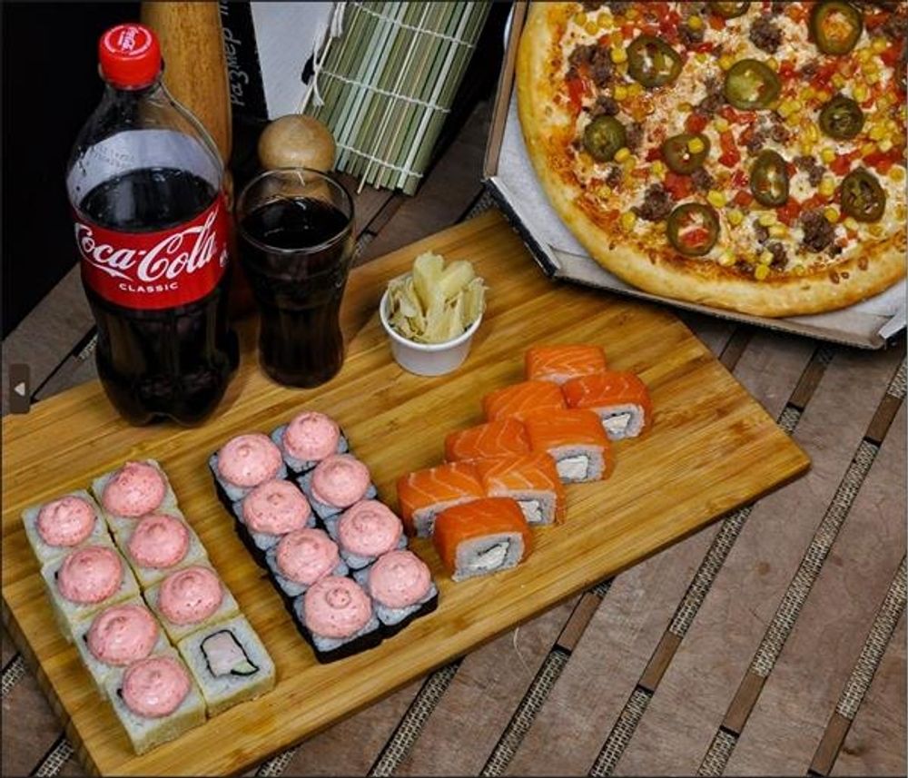 Ролл Фила + ролл кано + брат кано ролл + пицца 30см на выбор из акционных + напиток в подарок