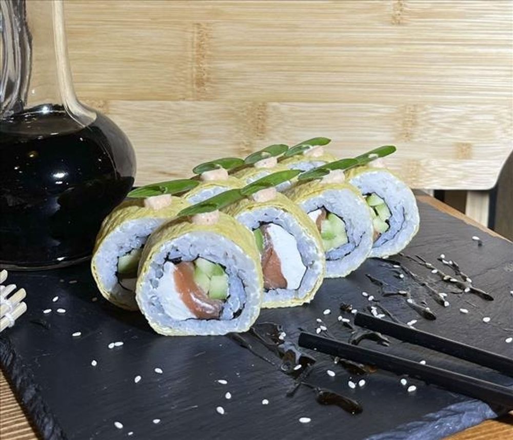 Сыр творожный, сёмга, авокадо, завернут в блин тамаго, спайси соус, лук зеленый