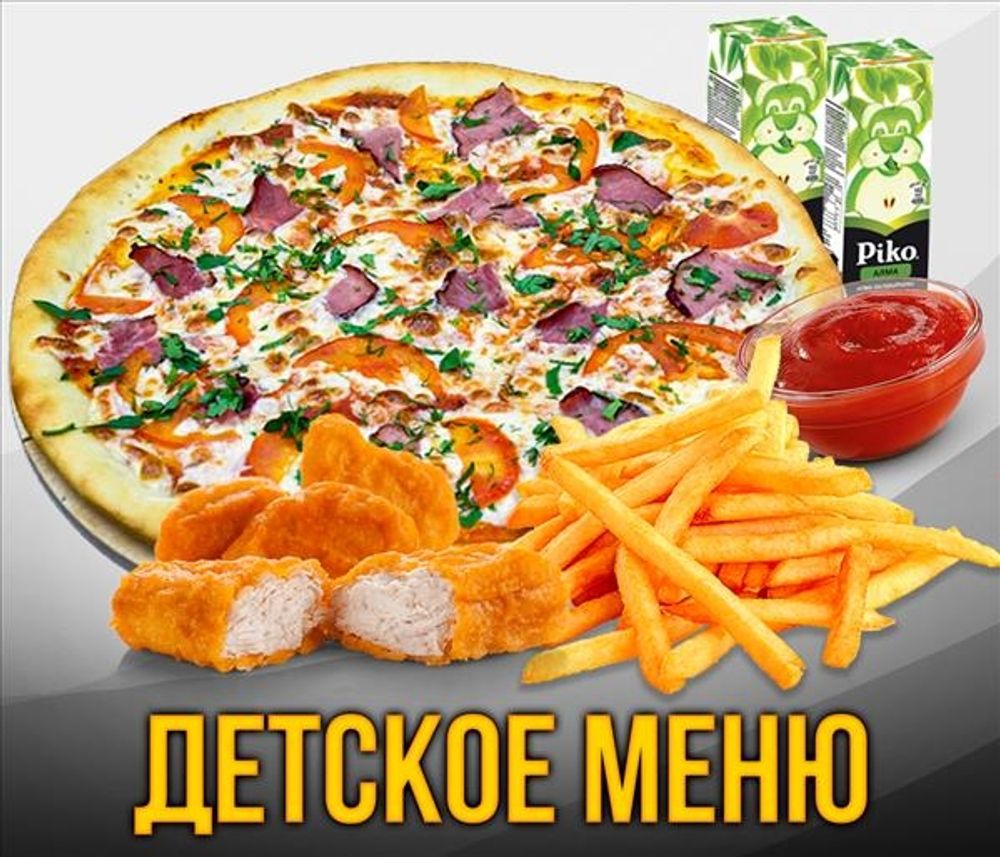 Пицца 25см из ряда акционных на выбор, фри, наггетсы, 2 сока с трубочкой, соус