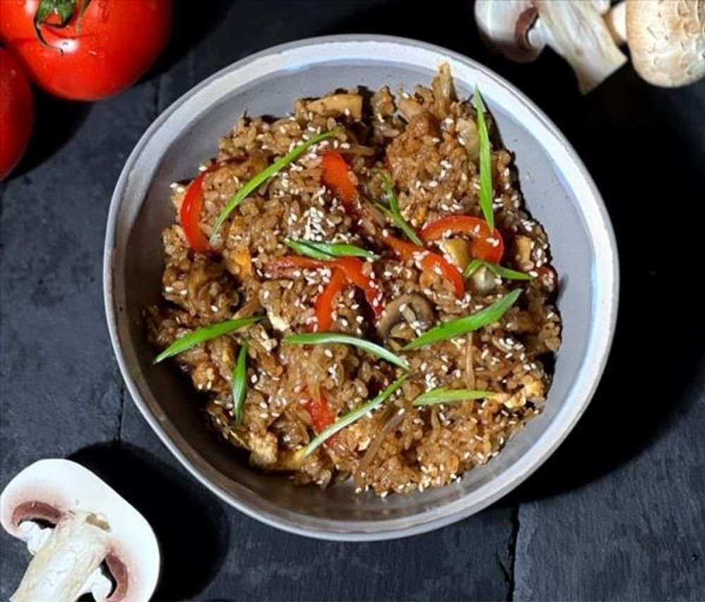 Жареный рис с яйцом, фирменный соус Black Pepper, куриное филе, болгарский перец, шампиньоны, лист салата, зеленый и репчатый лук, кунжут