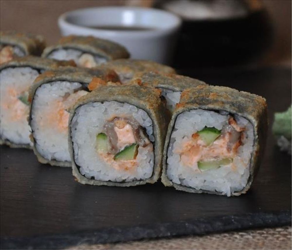 Сливочный сыр, угорь, огурец, панировочные сухари, кляр