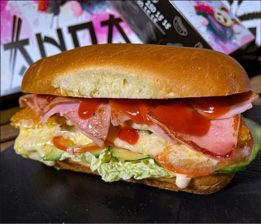 Фирменнная булочка, котлета из голандского сыра, ветчина куриная, маринованные огурчики, свежий помидор, пекинская капуста, фирменный соус, кетчуп, сыр чеддер