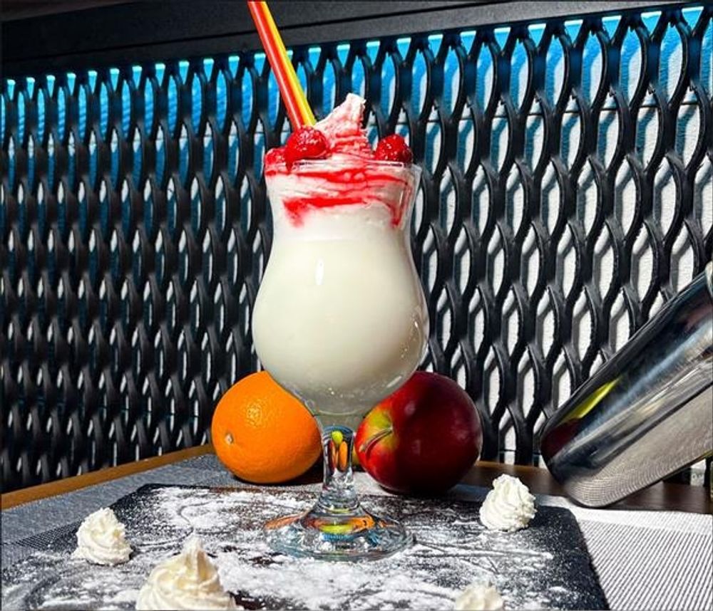 Молоко, мороженное, взбитые сливки, сироп малиновый, малина.