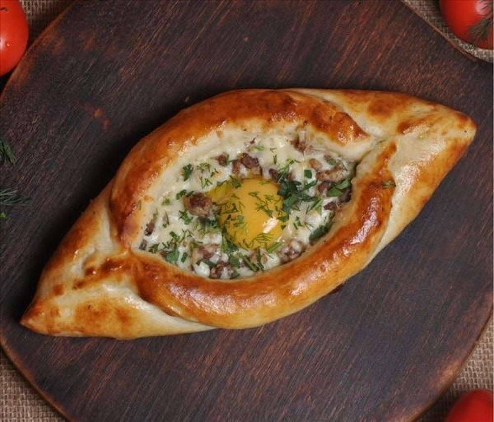 Сыр моцарелла, соус красный, фарш смешанный курица и говядина, яйцо, зелень