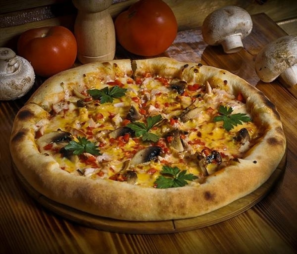Сырный борт, копченая курица, шампиньоны, болгарский перец, сыр чеддер, сыр моцарелла, зелень