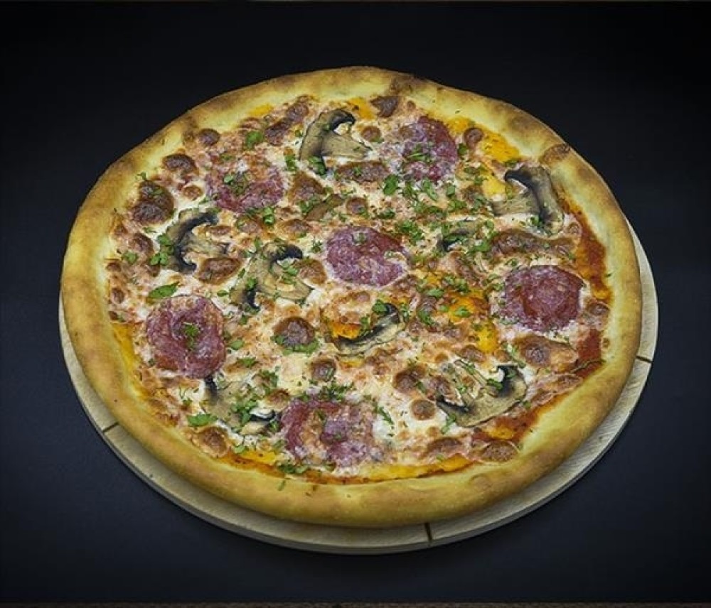 Сыр моцарелла, красный соус, шампиньоны, колбаса салями, халапеньо