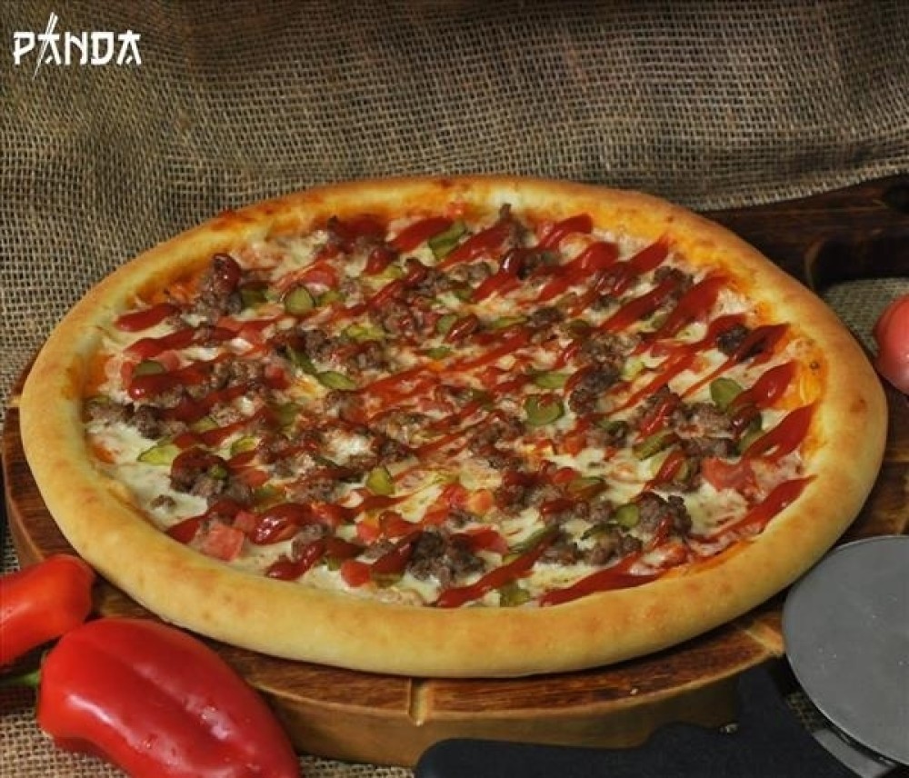 Сыр моцарелла, красный соус, корнишоны, помидоры, фарш говяжий, соус барбекю