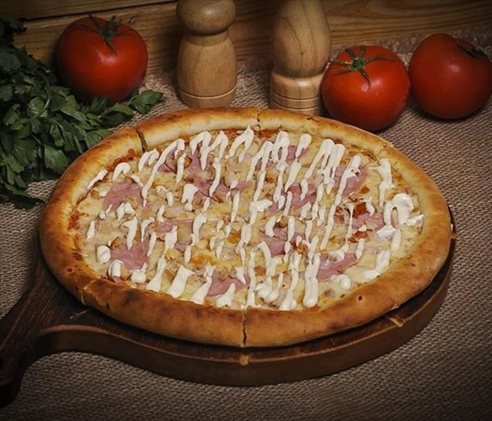 Сыр моцарелла, красный соус, куриная ветчина, грудка копченая, чесночный соус