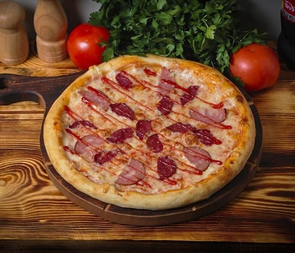 Сыр моцарелла, красный соус, куриная ветчина, мусульманская колбаса, соус барбекю