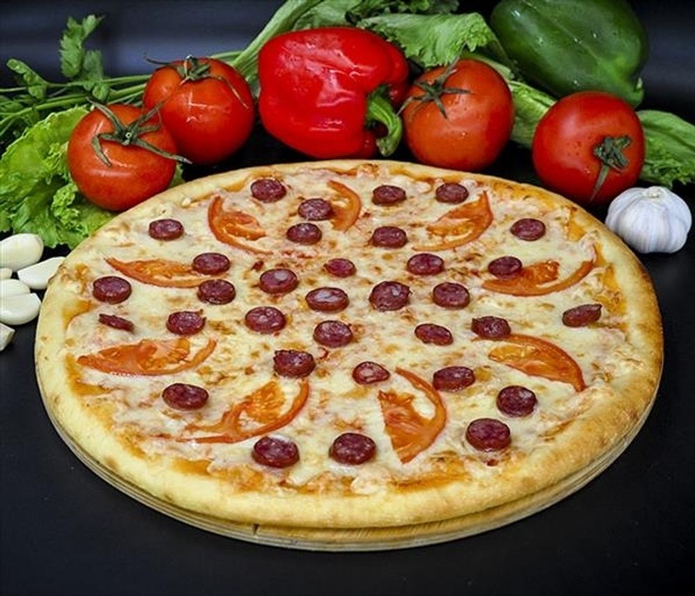 Сыр моцарелла, красный соус, охотничьи колбаски, помидор