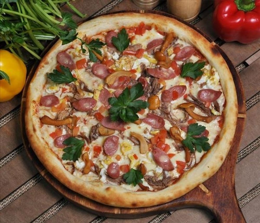 Сыр моцарелла, красный соус, фирменные сосиски, маринованные опята, помидор, рваная говядина, омлет