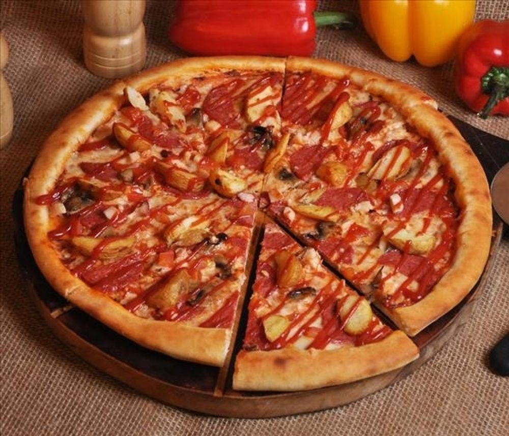 Сыр моцарелла, красный соус, шампиньоны, помидор, куриная грудка, мусульманская колбаса, картофельные дольки, барбекю соус