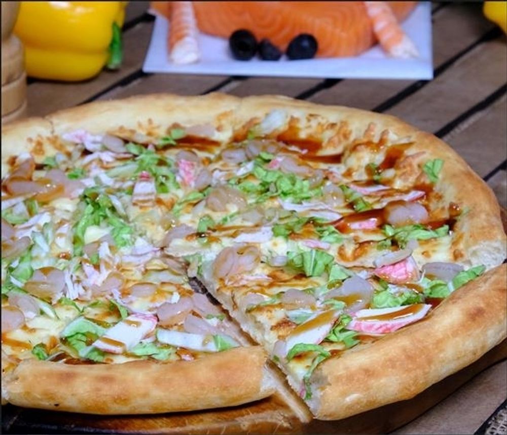 Тесто, белый соус, креветки, крабовое мясо, сыр моцарелла, лист салата, фирменный соус унаги.