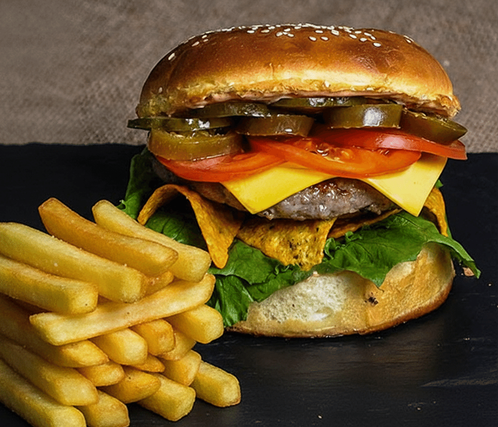 Сочная котлета из говядины, маринованные огурчики, свежий томат, пекинская капуста, ломтик сыра Чеддер, фирменный острый соус перчик халапеньо, кукурузные чипсы, фирменная булочка. Картофель фри в подарок.