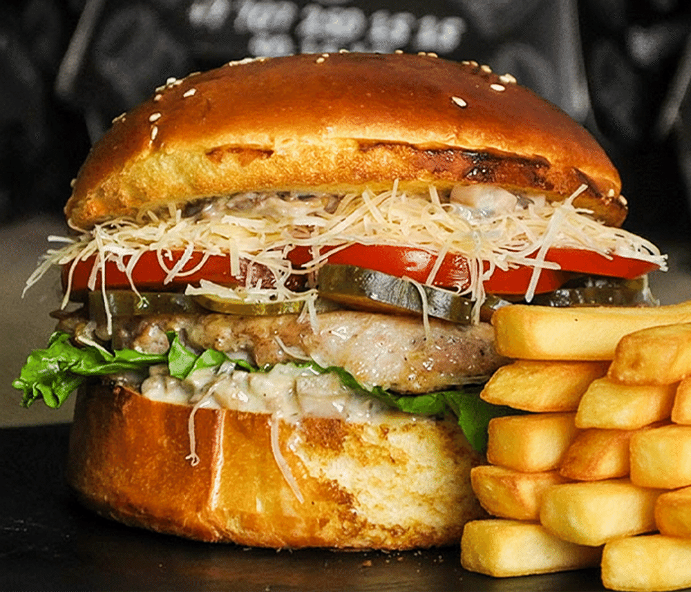 Нежная куриная котлета, маринованные огурчики, свежий томат, пекинская капуста, ломтик сыра Чеддер, фирменный грибной соус, сыр пармезан, фирменная булочка. Картофель фри в подарок.