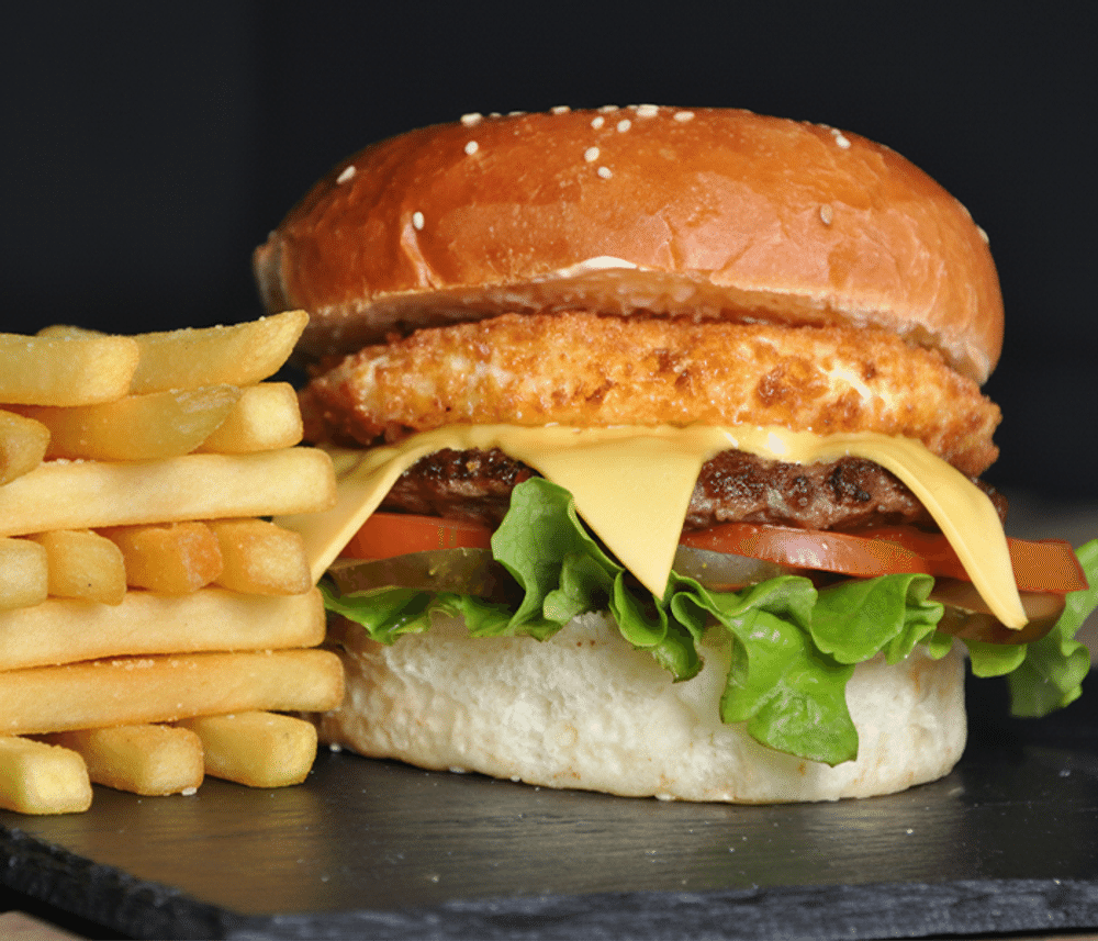Сочная котлета из говядины, маринованные огурчики, свежий томат, пекинская капуста, ломтик сыра Чеддер, фирменный соус, сырная котлета, фирменная булочка. Картофель фри в подарок.
