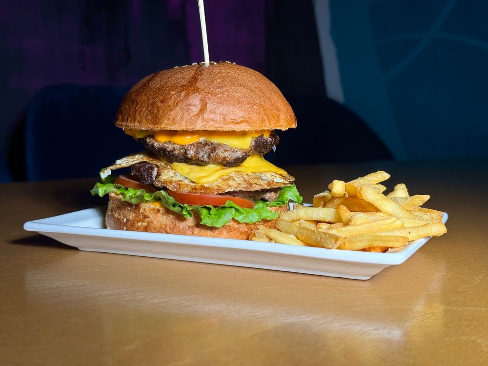 Фирменный бургер от панды с двумя сочными котлетами из говядины, маринованные огурчики, свежий томат, пекинская капуста, два ломтика сыра Чеддер, фирменный соус, жареное яйцо, фирменная булочка. Картофель фри в подарок.