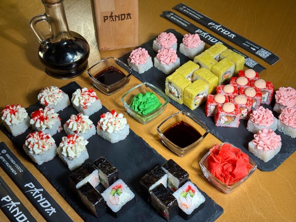 Состав сета:-Фреш ролл - творожный сыр, нори, огурец, лосось, соус спайси, тобико, рис;-Кани темпура - творожный сыр, нори, лосось, панировка, угорь, панировка, кляр, рис;-Ятоми ролл - творожный сыр, нори, курица, огурец, блин тамаго, тобико, рис;-Лава ролл - творожный сыр, нори, креветки, соус лава, рис;-Хотто ролл - творожный сыр, нори, креветки, огурец, тобико, рис