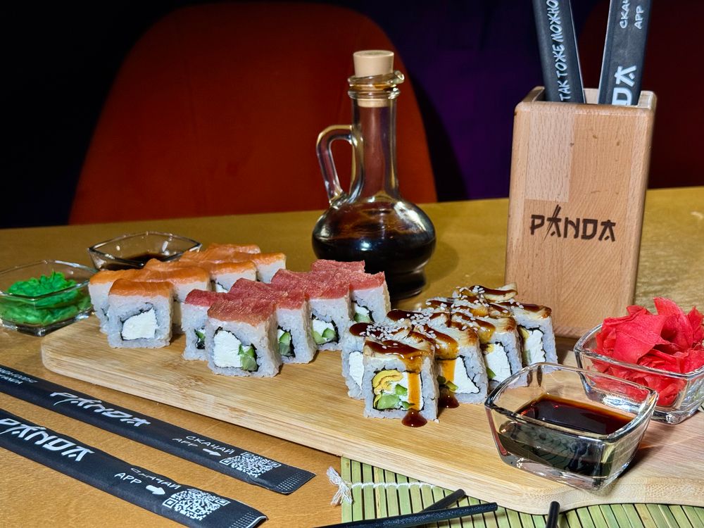 Сет из 24 роллов: -Фила оптима - творожный сыр, лосось, нори; -Треугольник с угрем - творожный сыр, огурец, блин тамаго, угорь, нори, рис; -Туна оптима - творожный сыр, тунецу, огурец, нори, рис