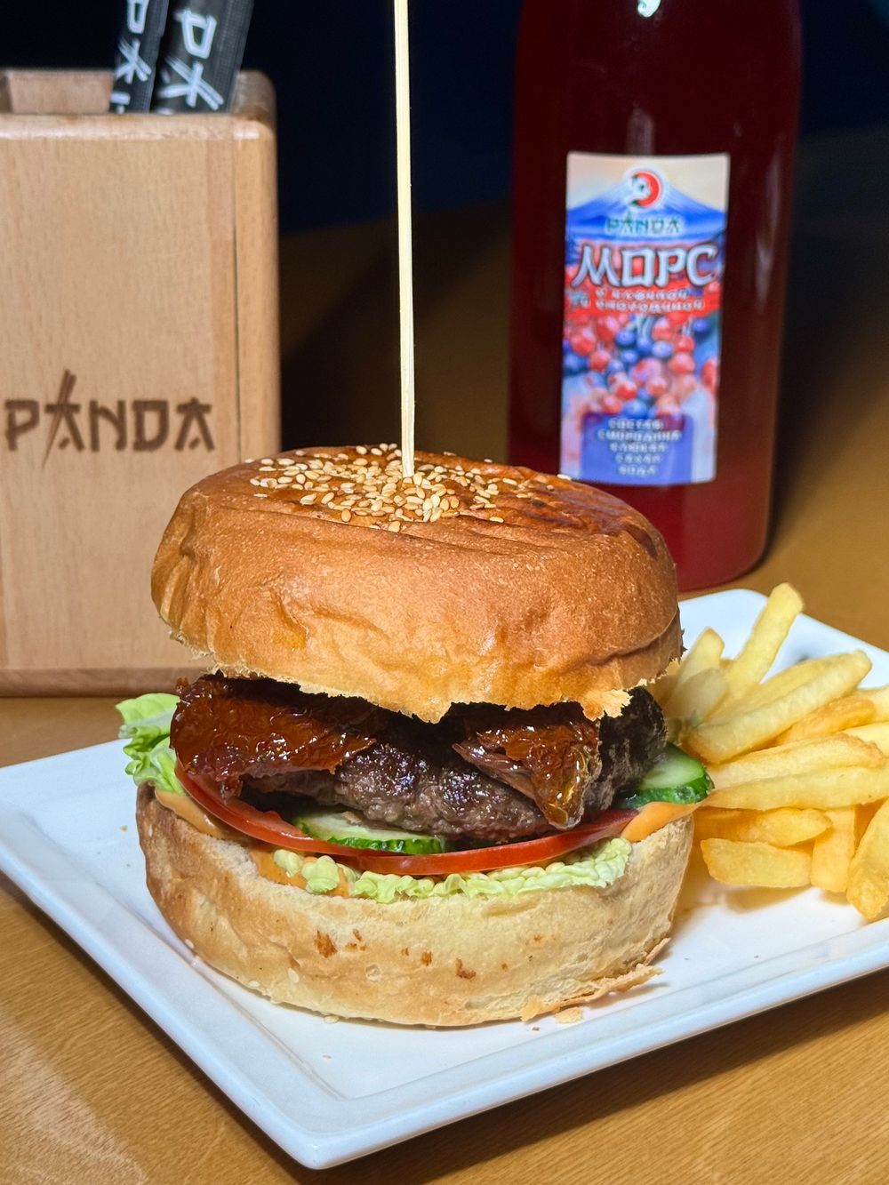 Фирменная булочка с сочной котлетой из говядины, вяленые томаты, свежий огурец, свежий томат, лист салата, фирменный соус. Картофель фри в подарок.
