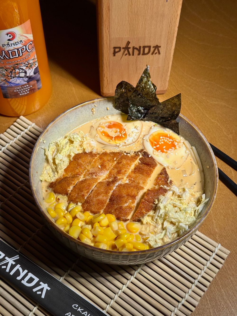 Бульон рамен, куриное филе, фирменное маринованное яйцо, пекинская капуста, кукуруза, сыр чеддер, пикантный соус ким чи